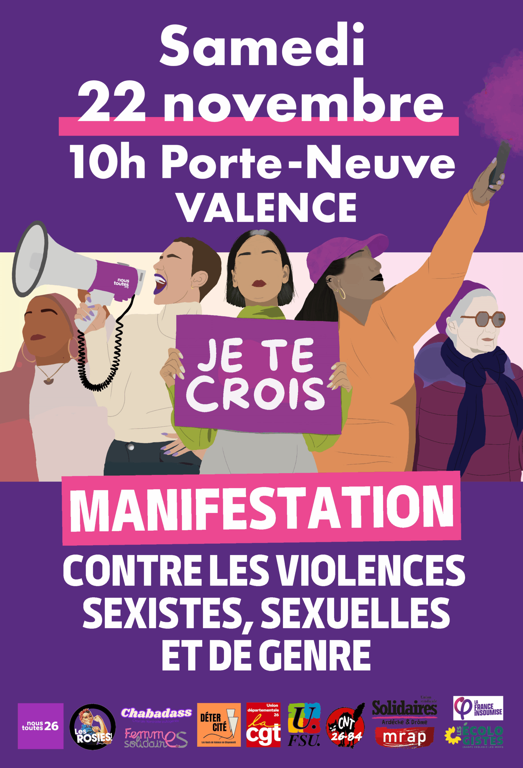 Samedi 22 novembre, nous marcherons pour rendre hommage à toutes les victimes de la violence machiste : RDV à 10h, Place Porte-Neuve à Valence et le 25/11 à Montélimar, 18h30 au Théâtre...