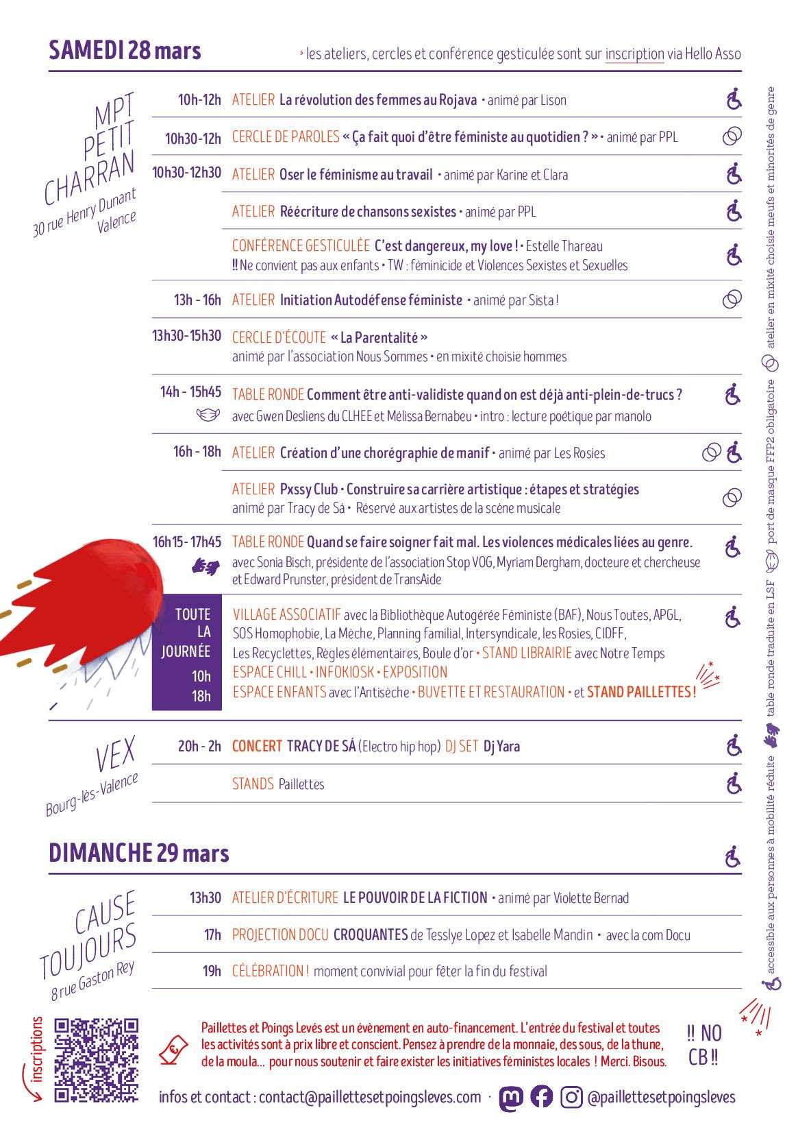 Au programme de la journée du samedi, le village associatif en continu de 10h à 17h30, des ateliers (dont un atelier de création et apprentissage d’une chorégraphie engagée avec des Rosies drômoises) et des conférences, buvette et restauration. En prime, une grosse soirée festive au Vex le samedi soir avec l’incroyable Tracy De Sà et ses lives survoltés ainsi que Yara pour vous faire danser toute la nuit !