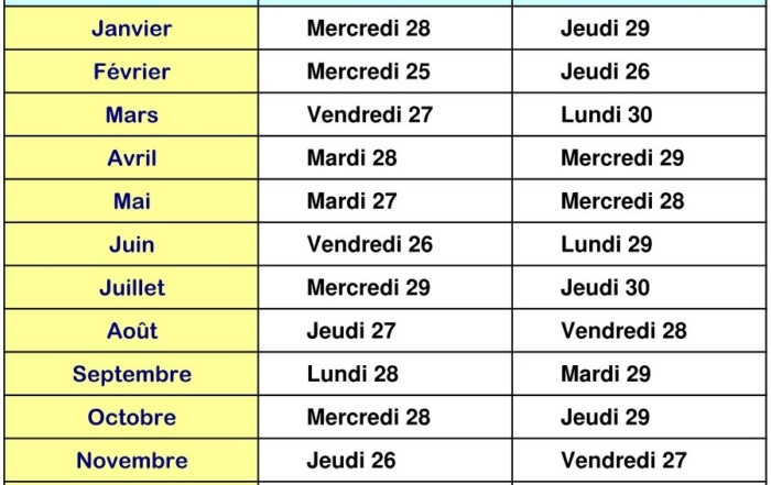 Calendrier des salaires et des pensions 2026