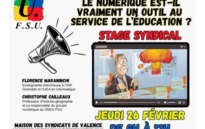 Les sections FSU 26 et 07 organisent un Stage "Public-Privé, concurrence déloyale : combattre les politiques qui favorisent le privé !", le JEUDI 27/11/2025, 9h-17h au POUZIN, salle Edith Piaf...